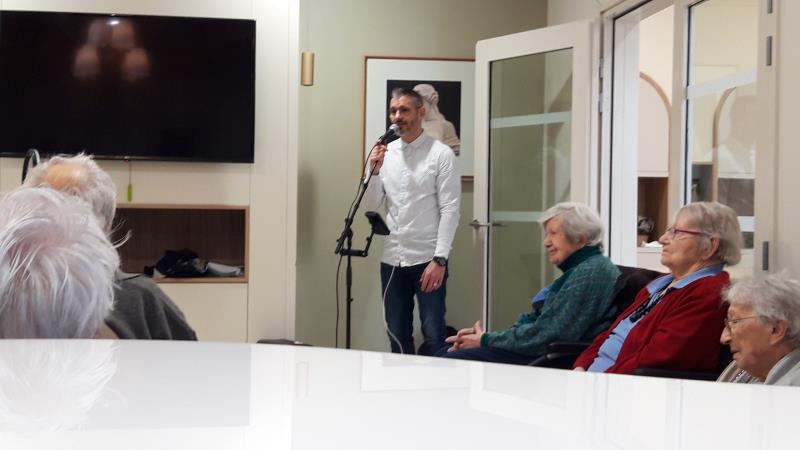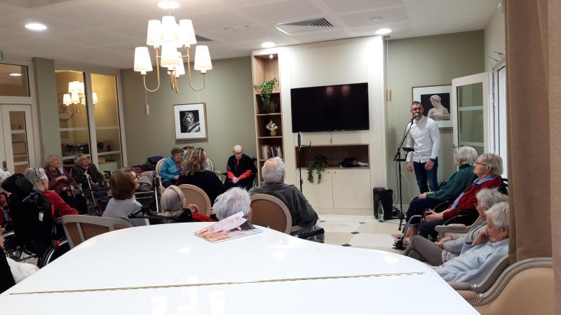 Cet après-midi Ludovic, bénévole et habitant de Cesson est venu nous régaler avec de belles chansons du répertoire populaire français, Bécaud, Guichard, Aznavour, Dassin, Bruel ... les résidents ont pris plaisir à l'accompagner en chantant. Un grand merci à Ludovic pour sa gentillesse et surtout sa magnifique voix !